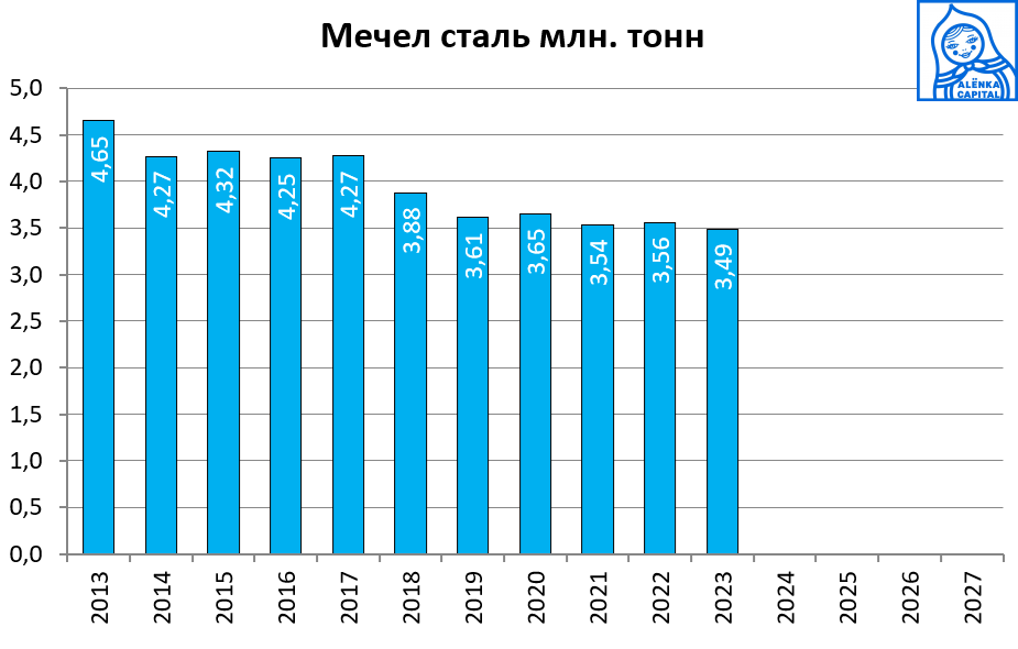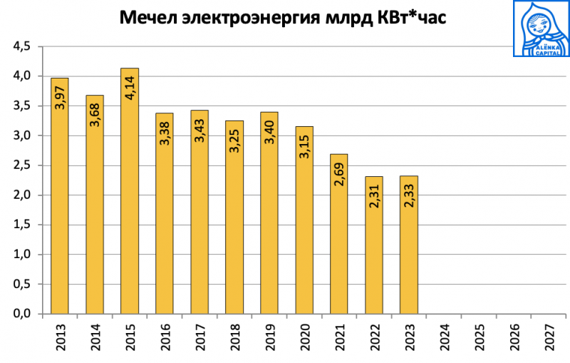 "В прошлом году реализовалось одновременно несколько неблагоприятных сценариев - снижение мировых цен на коксующийся уголь, падение внутреннего спроса на сталь, а также рост процентных ставок, которые оказывали давление на финансовые показатели "Мечела". В результате чистый долг умеренно подрос, по нашим оценкам, на 9%, а чистый долг/EBITDA составил 4,8х против 2,9х на конец 2023 г.", - отмечают в БКС.