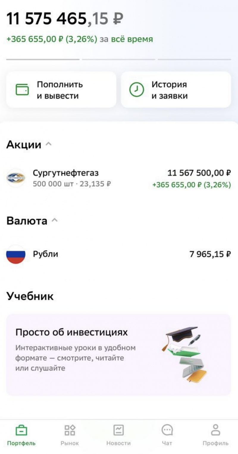 3. Докупил на счете жены в Сбербанке Сургутнефтегаз ао до 500 000 акций, как консервативное долгосрочное вложение, в том числе с целью получения Сбербанк первого.