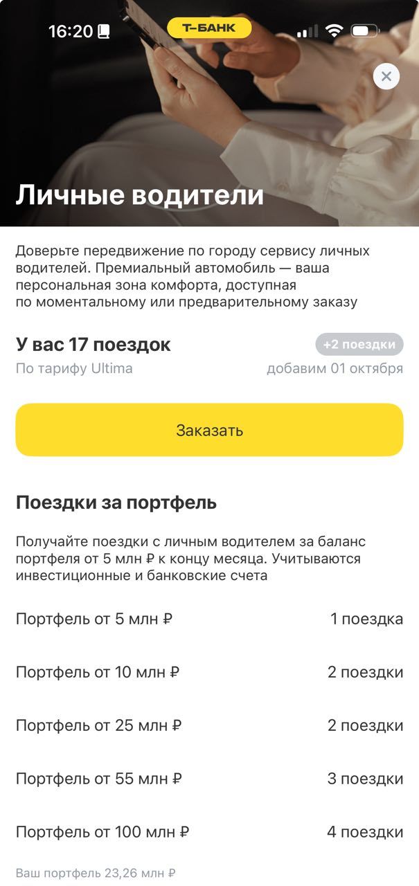 Из интересного наблюдения, с портфелем от 25 млн рублей в Т-Банке дают заказывать хорошие такси!
