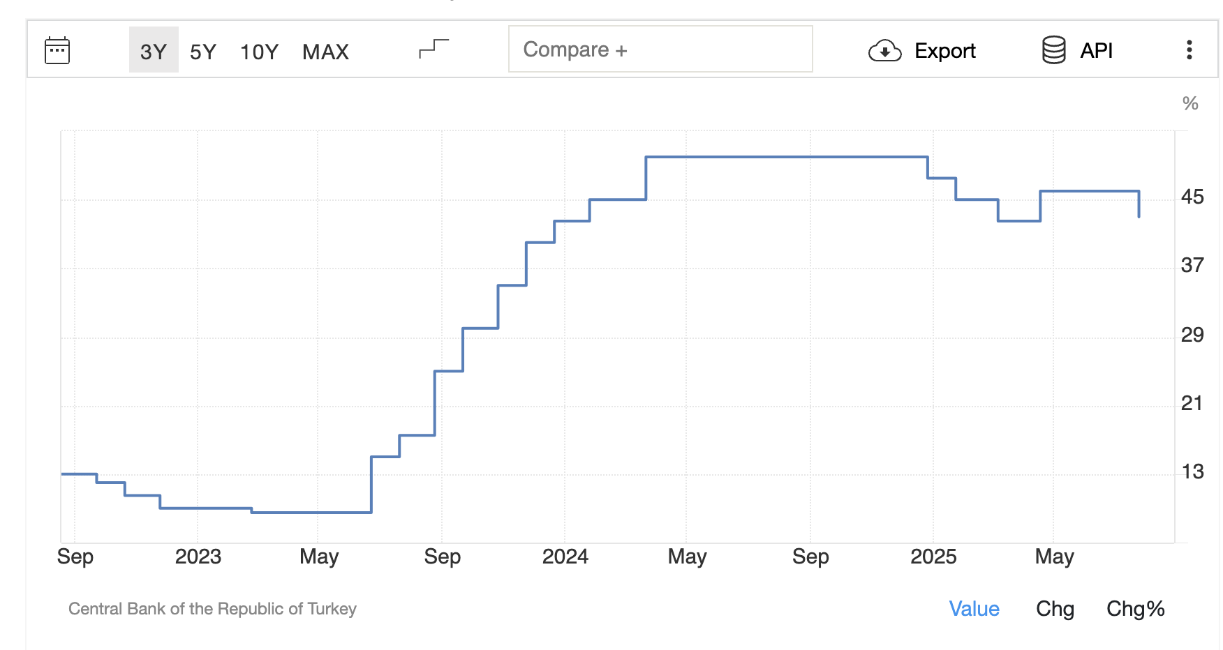 В Турции они борются высокой ставкой с инфляцией, но при этом каждый торговый день девальвируют лиру примерно на 0,15 %, в итоге лира плавно каждый день девальвируется примерно на 40 % годовых. При такой политике они убивают внутренний спрос, прибыли компаний ориентированных на внутренний рынок сильно падают, из-за этого по p/e рынок Турции не такой дешевый